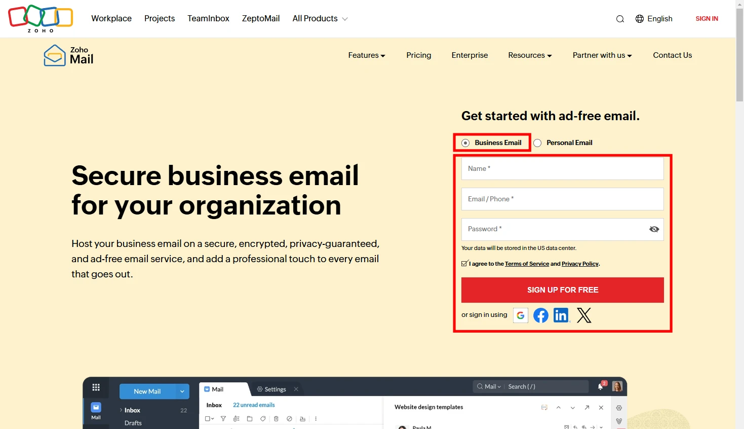 Go to the Zoho Mail website. The first step is to create a Zoho account. Select the Business Email option and proceed with the sign-up process. You can create an account by entering your name, email/phone number, and password, or you can sign up using your existing Google, Facebook, LinkedIn, or X accounts. Even if you choose to connect an external account, you can disconnect it later if needed, so pick the option that is most convenient for you.