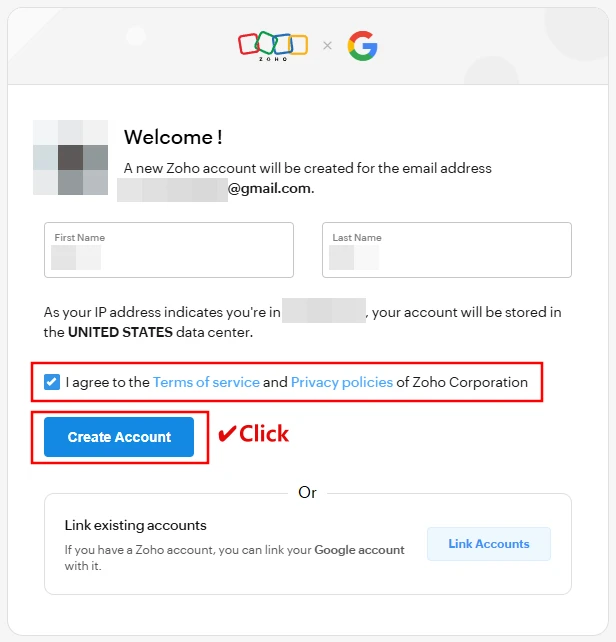 I decided to create my Zoho account using my Google Account. If you are not residing in the United States, you may encounter a notice stating that your data will be stored in the U.S. Simply check the agreement box and click the Create Account button to proceed.