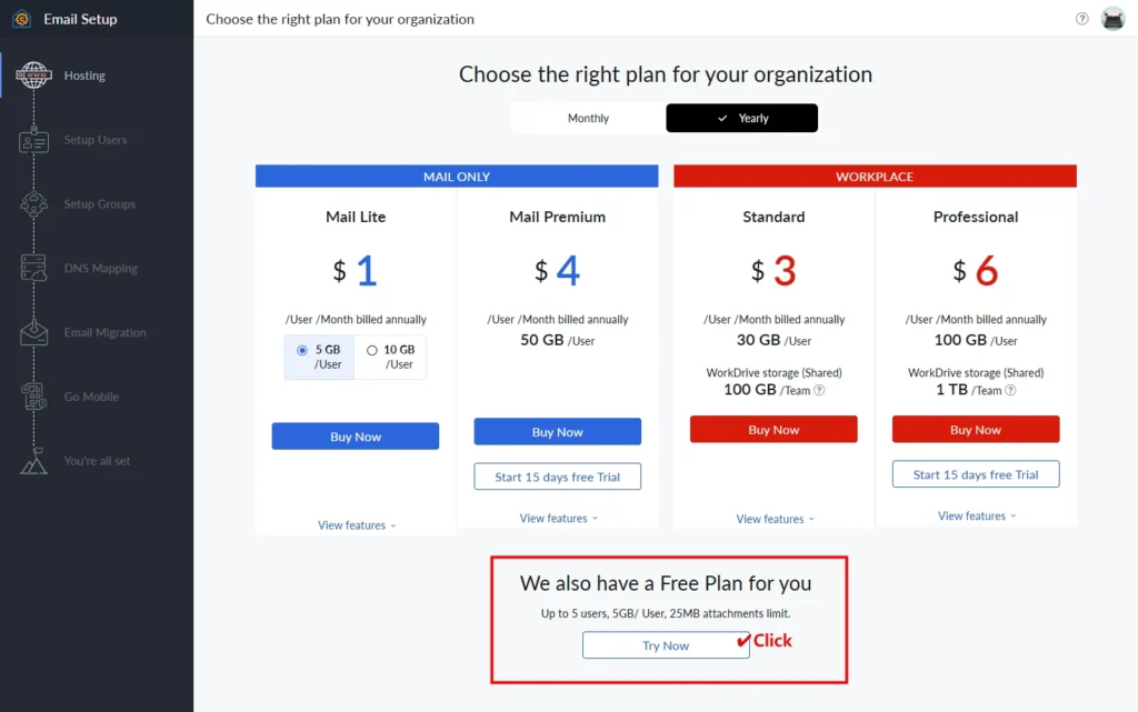 On the next screen, you will see the plan selection options. Zoho Mail offers two main categories of plans: Mail Only and Workplace. Selecting the Workplace plan provides access to additional productivity and collaboration features such as cloud storage, document management, team collaboration tools, chat, and video conferencing. However, if you only need an email service, the Mail Only plan should be sufficient. Be sure to review the pricing differences between monthly and yearly subscriptions.