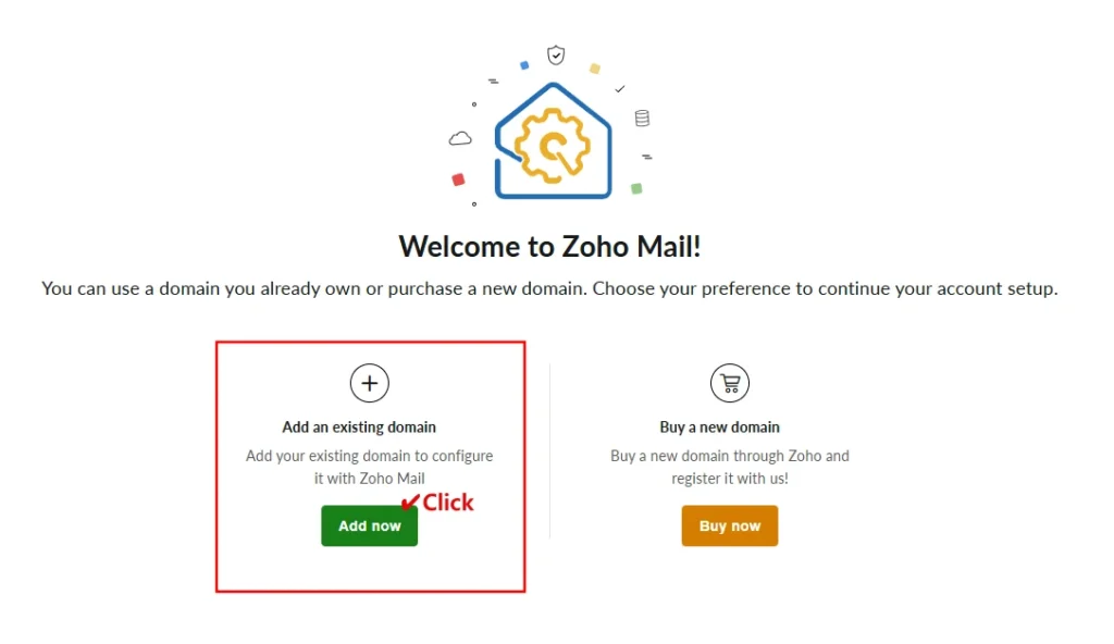 Next, you need to specify the domain to be connected to your account. If you already own a domain, click the Add Now button on the left. If you don’t have a domain yet, you can purchase one separately and return later, or you can buy a domain directly through Zoho by clicking the Buy Now button on the right.