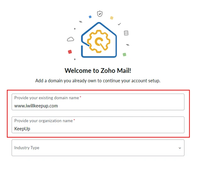 Once the next screen appears, enter your domain name and organization name. If you’re using Zoho Mail for a personal blog like me, you can create an organization name as you see fit. You can always change it later after the initial setup. The third field, Industry Type, is optional. Clicking on this field will display a list of industries to choose from. If your business falls under one of the listed categories, select the appropriate option. Once all details are entered, click the Add Now button below to proceed.