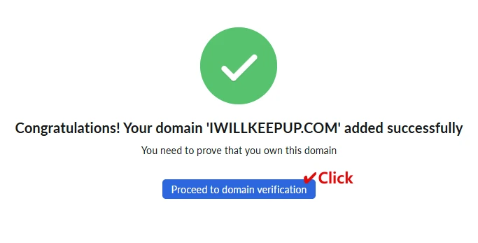 After successfully adding your domain, click the Proceed to Domain Verification button to move forward with the setup process.