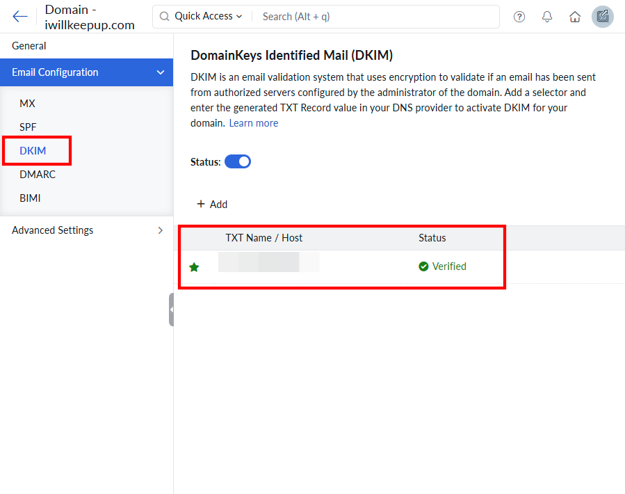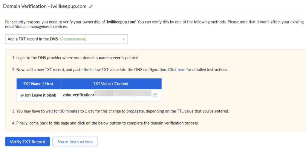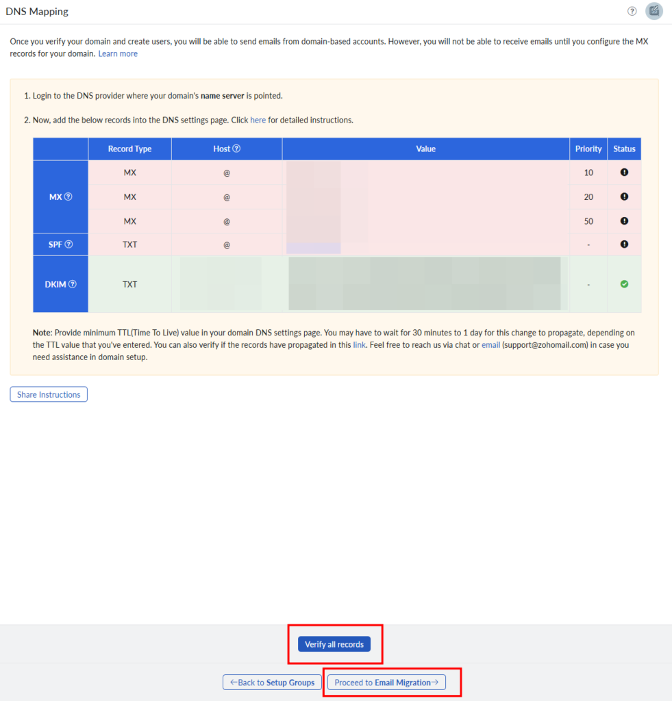 Now, return to the Zoho Mail Setup page and click the Verify TXT Record button. If successful, you will proceed to the next screen.