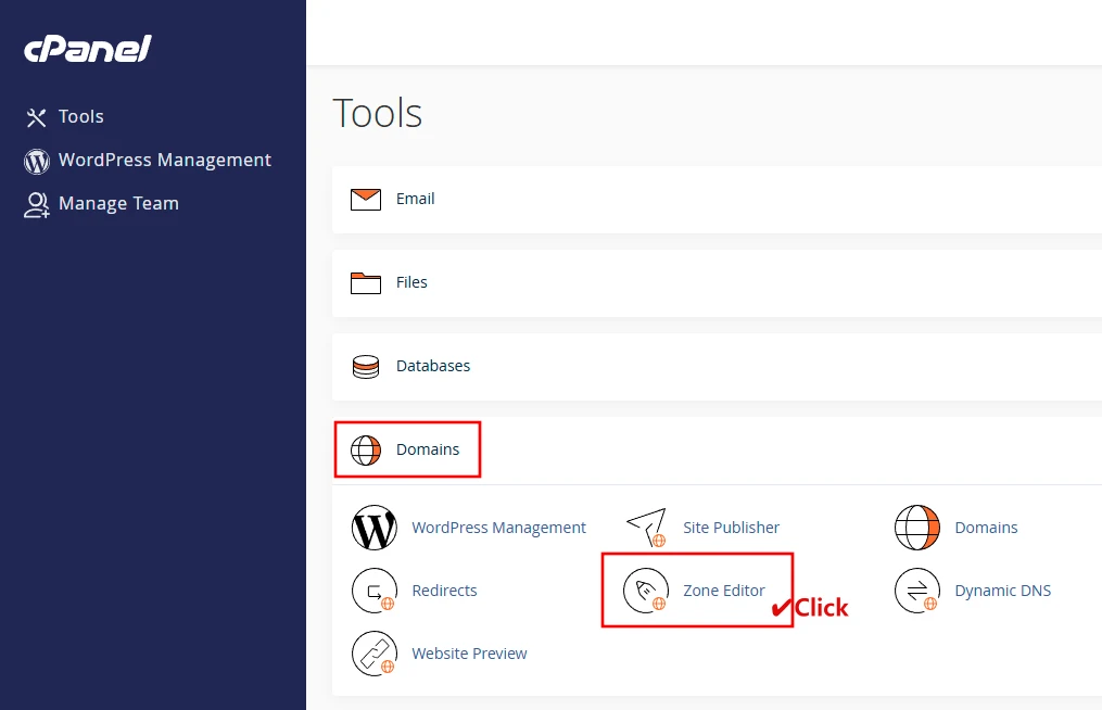 If you are managing your website through a hosting service, the DNS provider mentioned in the instruction step 1 refers to your hosting service provider. Open a new browser tab and log in to your hosting provider’s account. Once logged in, navigate to the cPanel and look for the Zone Editor option under the Domains section. Click on it to proceed with the domain verification steps.