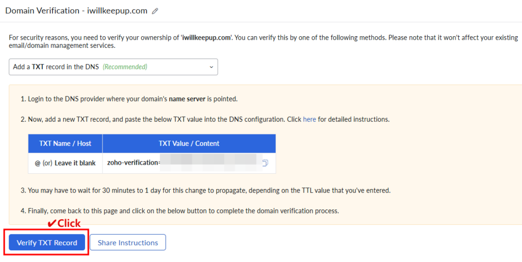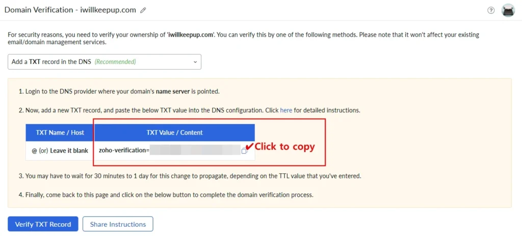 Keep the Zone Editor page open and switch to Zoho’s Domain Verification page to copy the TXT Value. Click the copy button to easily copy the value.