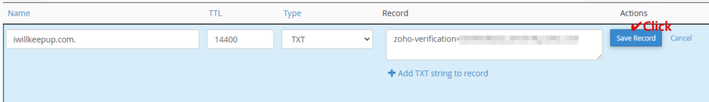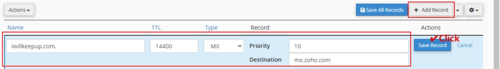 Then, click the Add Record button. A form will appear where you need to enter the values provided in Zoho’s guide.