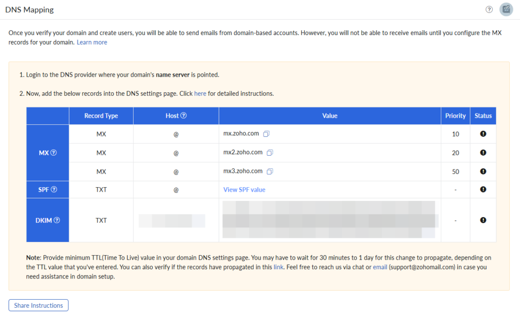 At the bottom of Zoho’s DNS Mapping page, click the Verify All Records button to initiate verification. Wait for the process to complete, and you will see the colors in the instruction table change. Successfully configured records will be highlighted in green, while those that are not yet functioning correctly will appear in red. As mentioned earlier, the propagation time varies based on TTL values, so even if the records were added correctly, they might still show as red.
