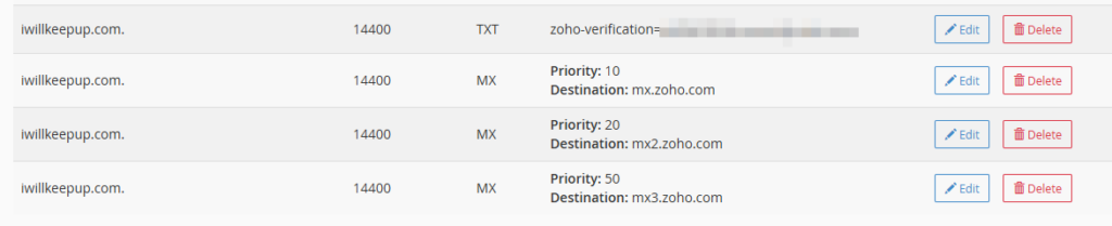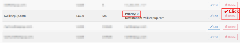 Important: After adding the records, check if there are any existing MX type records with a priority value lower than 10 or set to 0. If you find any records with a priority of 0 or below 10, delete them by clicking the Delete button. When I initially set up my email, I overlooked this step and didn’t remove the record with priority 0. As a result, I couldn’t receive emails correctly, which caused significant confusion while troubleshooting.