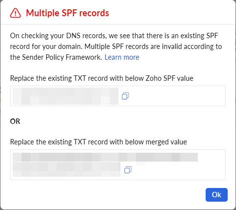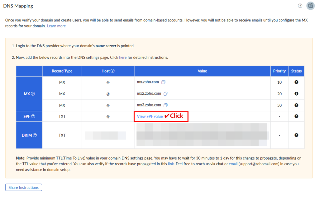 Now it’s time to add the SPF record. Go back to the Zoho instruction page and click on View SPF value.