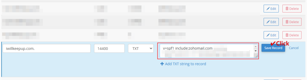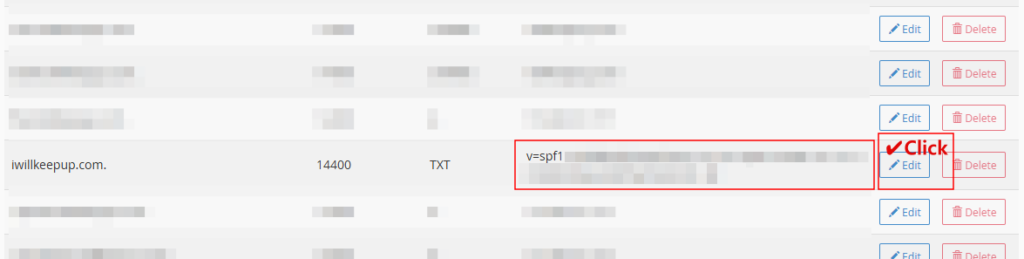 Return to the Zone Editor and check if there is already an SPF-related record in the list. There should only be one SPF record in the list, so instead of adding a new record, click the Edit button next to the existing SPF entry.