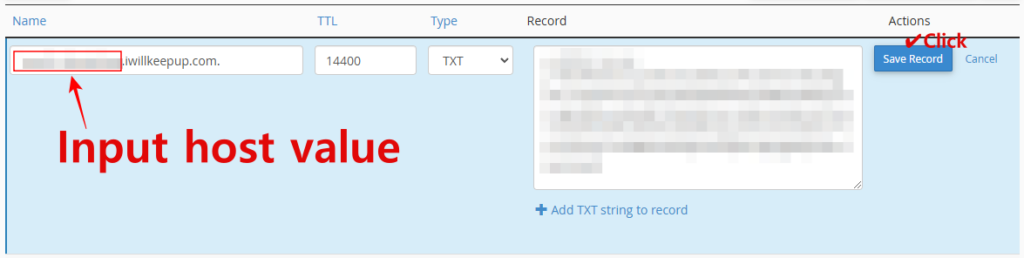 Click Add Record in the Zone Editor to add a DKIM record. In the Name field, enter the Host value from Zoho’s DNS Mapping instruction page, prepending it to your domain. It should be formatted as: HostValue.Domain.TLD.