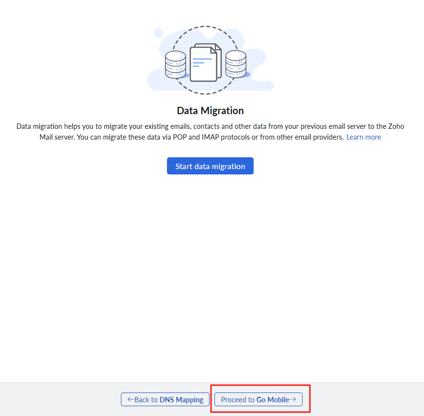 In this step, you can migrate data from your previous email account to the newly created Zoho Mail account. Since I did not have an existing business email, I skipped the Data Migration process. In this guide, I will also skip explaining Data Migration. Click the Proceed to Go Mobile button below to continue.