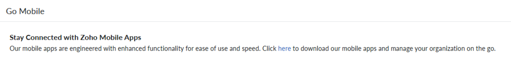 On the Go Mobile page, Zoho introduces its mobile apps. Clicking on the link in the middle of the page will take you to the mobile app introduction page. If you do not intend to use the mobile app, you can click the Proceed to Setup Completion button at the bottom to move to the next page.