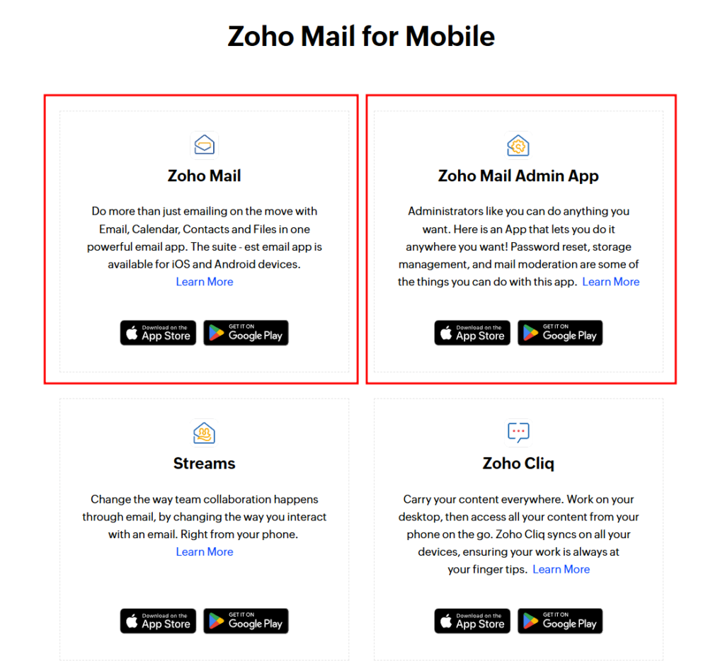 There are two types of Zoho Mail mobile apps available. The Zoho Mail Admin App includes additional administrative features. Depending on your needs, you can choose either one to install and use.