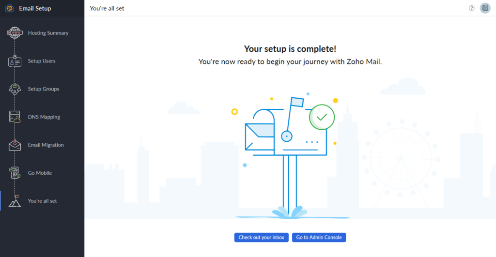 A message will appear indicating that the Zoho Mail setup is complete. Congratulations! However, there are still a few tasks left to finish. Please follow the next steps.