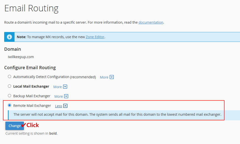 On the Email Routing page, select the Remote Mail Exchanger option and click Change. This setting ensures that emails sent to your domain are received by Zoho Mail’s servers.