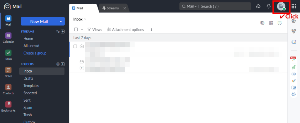 It is recommended to perform this step one day after the initial setup. If the initial setup is complete, logging into Zoho Mail will take you directly to the inbox screen. From the inbox, follow these steps to access the verification menu.