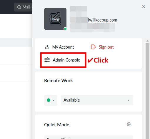 Click on the profile image in the top-right corner, which will open a side menu. From the side menu, select the Admin Console option.