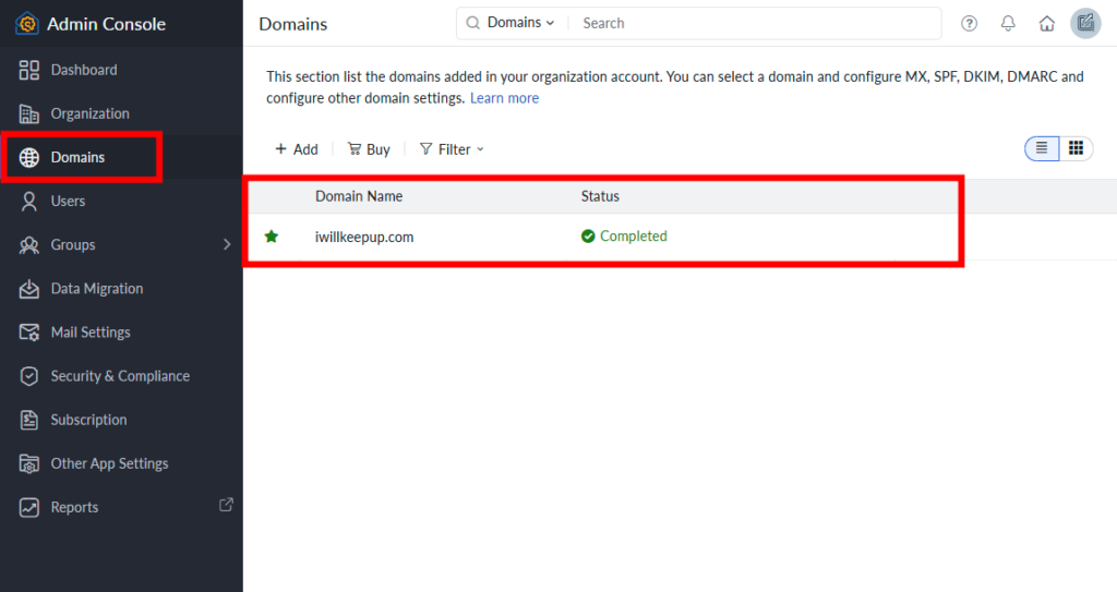 Once you are in the Admin Console, click on the Domains menu. Here, you will see your domain name and its status. In my case, the status displayed as Completed, but depending on your setup, it may show a different status. Click on your domain name to proceed.