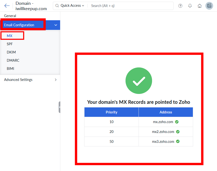 On the next screen, click on Email Configuration, then select the MX tab. If the DNS settings have been applied successfully, you will see check marks displayed.